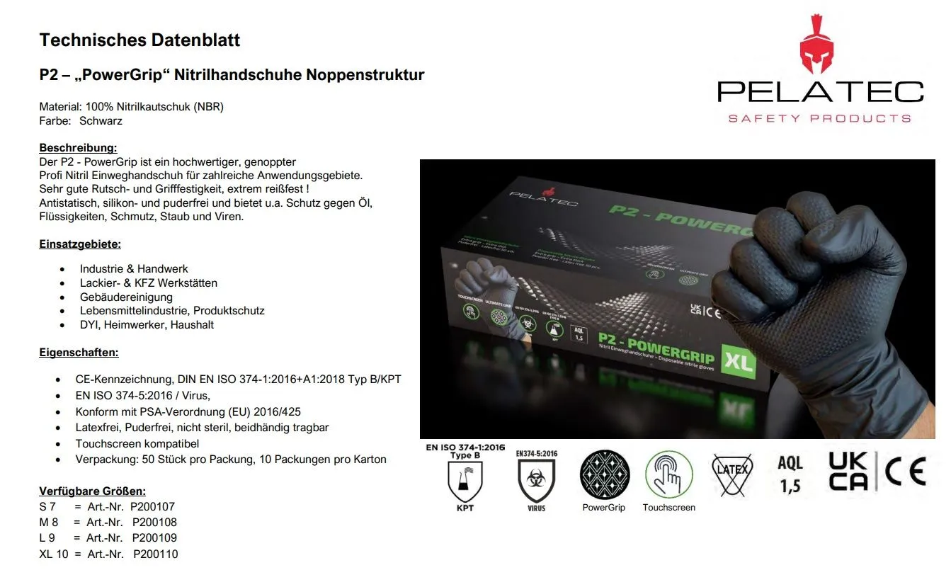 Produktinformationen "Pelatec P2 Power Grip - Nitril Einweghandschuhe Gr. L (8-9)"