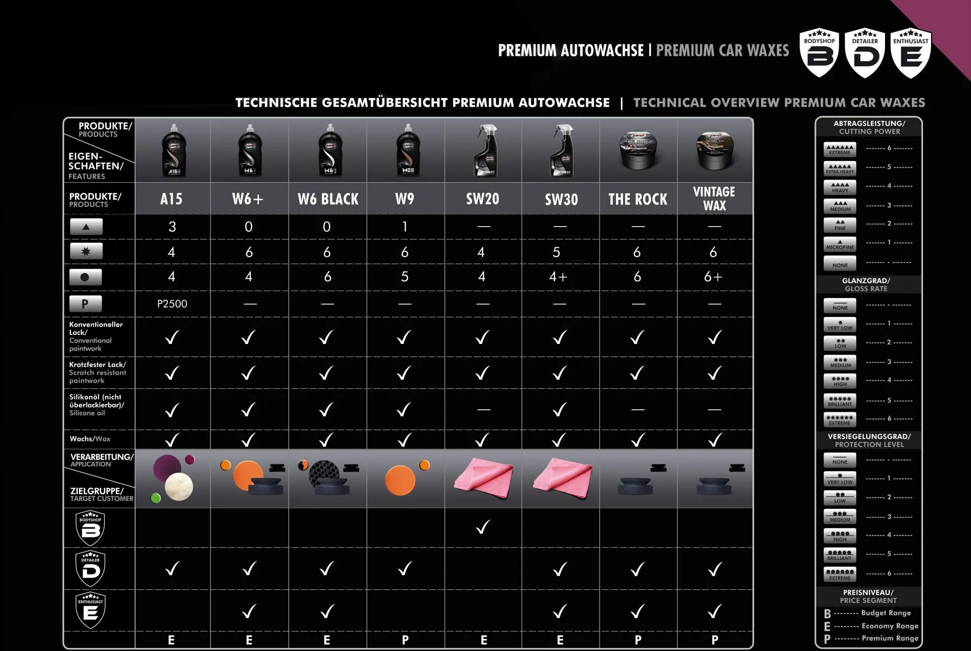 Das Premium Car Wax W6+ ist eine besonders leistungsfähige und moderne Lackversiegelung. Natürliches Carnauba-Wachs und hochwertige synthetische Komponenten schützen den Lack dauerhaft vor Witterungseinflüssen und sorgen für einen satten und lang anhaltenden Spiegelglanz. Die einfache Handhabung wird Sie überzeugen.